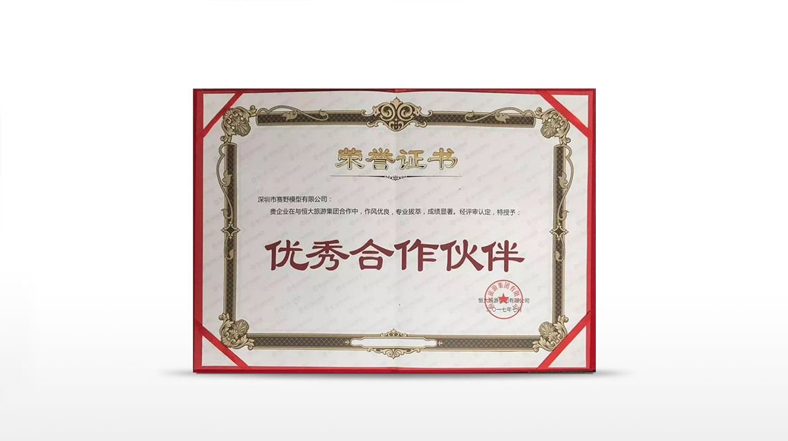 赛野模型荣获“恒大旅游集团优秀合作伙伴”荣誉证书