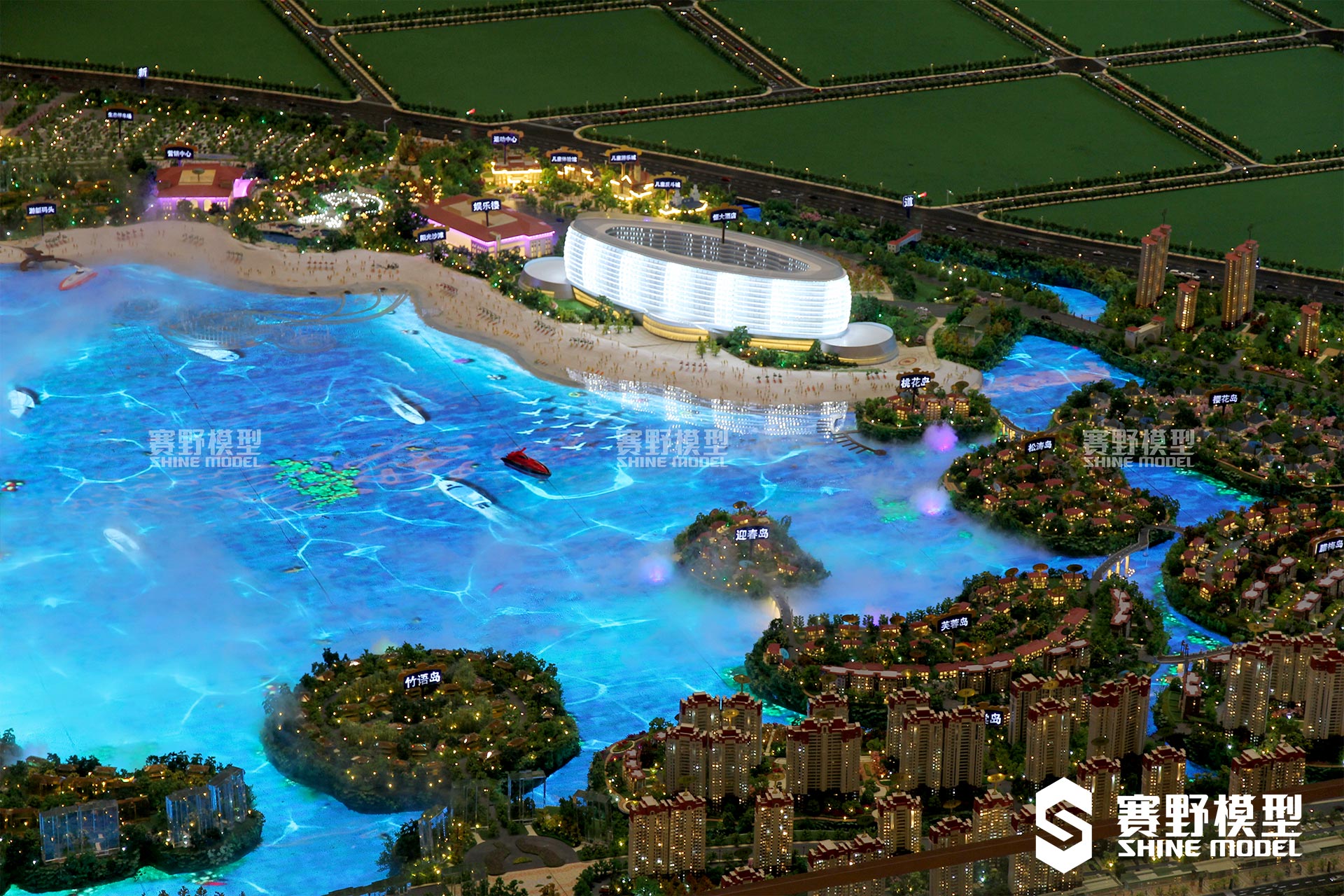 恒大阳光半岛项目,沙盘在表现形式采用全写实制作,整个沙盘根据展厅的设计效果,采用下沉式设计制作。在水系的设计制作中,赛野模型采用真水+LED显示屏通过显示画面将游艇码头、动态游艇、湖中鱼儿等场景动态逼真的体现,使湖面景色更加生动有趣。